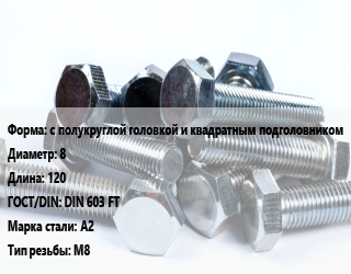 Болт с полукруглой головкой и квадратным подголовником 8х120 DIN 603 FT Сталь: А2 М8, цену уточнять, кг цена от 121.5 ₽ / кг, где купить, условия доставки в Краснодаре и Краснодарской области