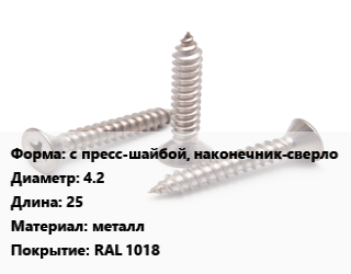 Саморез с пресс-шайбой, наконечник-сверло D=4.2 L=25 металл RAL 1018, шт цена По запросу где купить, условия доставки в Краснодаре и Краснодарской области
