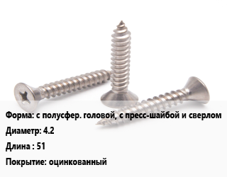 Саморез с полусфер. головой, с пресс-шайбой и сверлом D=4.2 L=51 оцинкованный