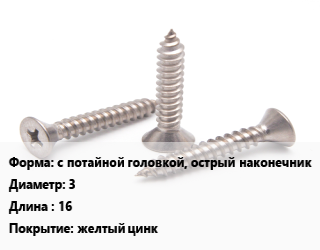 Саморез с потайной головкой, острый наконечник D=3 L=16 желтый цинк, упаковка 40000 шт цена от 4 045 ₽ / кг, где купить, условия доставки в Краснодаре и Краснодарской области