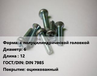 Винт с полуцилиндрической головкой 6х12 DIN 7985 оцинкованный, кг цена от 122.37 ₽ / кг, где купить, условия доставки в Краснодаре и Краснодарской области