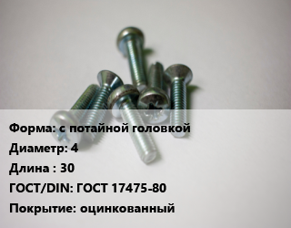 Винт с потайной головкой 4х30 ГОСТ 17475-80 оцинкованный, упаковка 1000 шт,упаковка 5 кг, кг цена от 240.59 ₽ / кг, где купить, условия доставки в Краснодаре и Краснодарской области