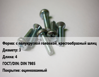 Винт с полукруглой головкой, крестообразный шлиц 3х4 DIN 7985 оцинкованный