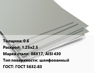Лист нержавеющий 0.6 1.25х2.5 Сталь: 08Х17, AISI 430 Тип:шлифованный ГОСТ 5632-83
