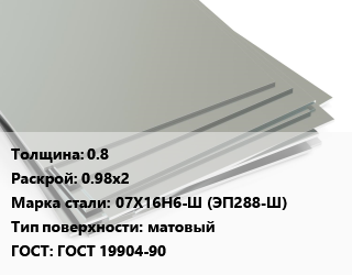 Лист нержавеющий 0.8 0.98х2 Сталь: 07Х16Н6-Ш (ЭП288-Ш) Тип:матовый ГОСТ 19904-90